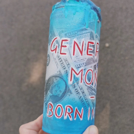 The DNA double helix — handcrafted, raw, expressive — rises from a spray can wrapped in money motifs and the powerful statement: "Generation Money – Born in Vision."